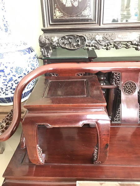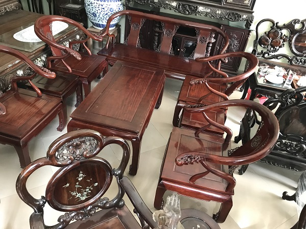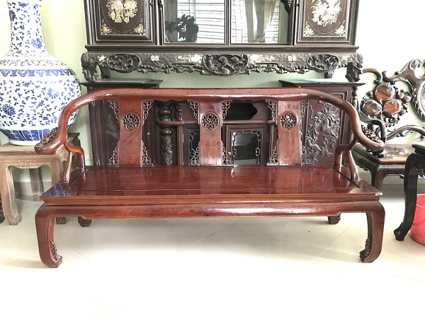 Bộ bàn ghế minh gỗ hương ta 8 món được các ghệ nhân Đồng Kỵ sản xuất năm 2005 tinh sảo mộng trắc chắn đẹp xuất sắc. Bộ ghế gồm 1 ghế dài, 4 ghế đơn, 1 bàn 2 đôn kẹp. Mua hàng liên hệ ngay 0936.681.666